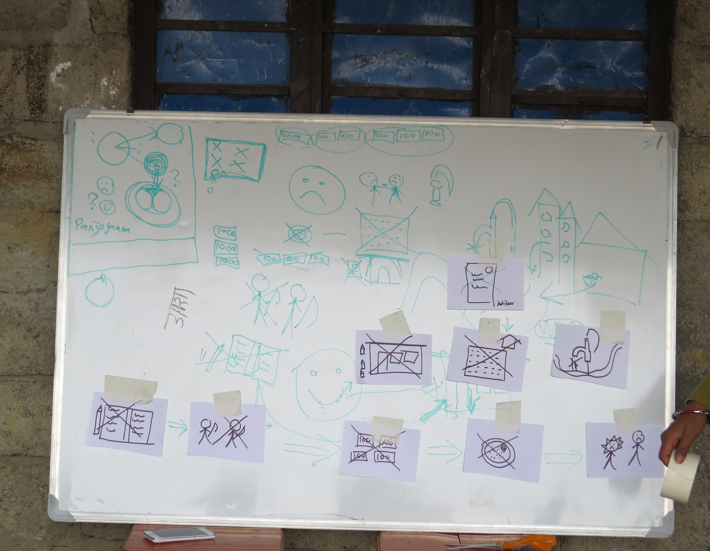 Keshar Kumari Musahar (aka Sabitri) blev interviewet til Radio Kantipur. Kvinderne fra Soiya var i sin tid en lyttergruppe hos Radio Lumbini i Butwal, så de kender en del til det at være “on air.”Og så drog Lis, Sukumaya og Prajwal afsted. Først fik de selvfølgelig en tikka! Lis var meget imponeret over kvindernes lærevillighed og evne til at stille de helt rigtige spørgsmål. Jeg havde samme indtryk: Alle var topmotiverede og havde virkelig forstået meget.Lis’ besøg betød meget for kvinderne. En ting er at få besøg af en udviklingsarbejder/journalist som undertegnede. Men en rigtig økologisk landmand, der har haft egen gård i 30 år, det var straks noget andet!Efter Lis’ afrejse tog Soiya Women’s manager Menuka Neupane, forkvinde og næsteforkvinde, Asha, der er ansat og jeg hen og så på en ny mulig skolemadsskole. Vi kunne på ingen måde få ørenlyd på kontoret, før vi havde været rundt i alle skolens 8 klasser og hilse på børnene.Skolen vi besøgte, var ret velfungerende og ville gerne være med i projektet. Efter besøget snakkede vi en del om kriterierne for en ny madskole. Var de her meget fattige? Spurgte jeg, og kvinderne sagde “ikke som os.” Så nu er vi på udkik efter en skole med flere fattige elever.Vi havde også besøg af Sujata Biswokarma fra organisationen FEDO (feminist dalit organisation) i Palpa. Hun er kvindelig dalit aktivist og samtidig projektmanager, og har lovet at komme og coache Menuka i nogle af de praktiske ting, som hun stadig mangler at få helt styr på i organisationen. Samtidig skal Sujata være ressourceperson på en teaterworkshop om kvinders og børns rettigheder i Soiya her i december. Her er Sabitri ved at vise hende drivhuset.Sabitri viser Sujata og Menuka de “Pottemagere,” de har fået til projektet. Man laver små urtepotter af avispapir.Den mest vellykkede af evalueringsaktiviteterne var tre små teaterstykker, som kvinderne skulle opføre i grupper. Det på billedet handlede om, hvordan man går i banken. Det blev spillet med masser af rekvisitter og en fantastisk indlevelse. “Der mangler en underskrift,” sagde Mangali, der spillede bankdame og så måtte Aarati tilbage til landsbyen og have en underskrift mere på sin check. Senere på dagen var Sita og Saraswoti i den rigtige bank i Butwal, det er nok ikke tit, de har besøg af kvinder ude fra landet der.Efter banken skulle en gruppe spille “hvordan køber man noget til organisationen?” Sita var en herlig butiksindehaver, der forsøgte at prakke Asha og Saraswoti alt muligt bras på. “Vi skal bare have frø, vi laver det hele selv og det er økologisk!” Var svaret. Derefter gik de hjem med tingene til Sabitri og blev straks afkrævet en kvittering – ingen slinger i valsen der!Det tredje skuespil handlede om, hvordan de, som har været i Kathmandu lærer fra sig til deres medsøstre. Det, synes alle, var rigtig fint. Vi fik gennem teaterstykket en god snak om, at det ikke er altid at undervisere er enige i, hvordan noget skal gøres. Fx. har Lis sagt, at der skal plantes i lige rækker. Mens underviseren mr. Dhungana har sagt, at man kan samplante.Hvad er formålet med jeres organisation? Det var ikke det letteste spørgsmål at besvare. Men faktisk gik det fantastisk. Sujara hjalp gruppen her og svaret var helt korrekt: At hjælpe kvinder til et bedre og sundere liv og en bedre indkomst. Sujata kendte ikke formålet i forvejen, så hun kunne ikke hjælpe. Tænker at det var nemt, fordi formålet er så praktisk og tæt på kvinderne selv.En herlig sidegevinst ved projektet har været, at organisationen har kunne sælge stiklinger til alle i området. Deres nye drivhus er nemlig det eneste i miles omkreds. Prisen ha de fået sat for lavt. Hvilket understreget behovet for et kursus i at lave en forretningsplan.Vi skulle også jo også have formuleret en fortsættelse til vores projekt. Her kikker kvinderne interesseret i bogen fra CISU omkring evalueringer. De var hele vejen igennem topmotiverede og positive.Først sagde kvinderne: “Du kan bare skrive det, du kender vores problemer,” og da jeg sagde, kom nu, I skal selv være med. så gik det først lidt trægt. “Har I jord?” spurgte jeg, næ nej det havde de jo ikke, “er det et problem?” “JA! meget” var svaret og så var tankerne sporet ind på ideen og problemerne kom rullende.Her har vi Soiya kvindernes problemer: Ingen uddannelse og ingen jord, derfor dårligt betalt arbejde og deraf manglende muligheder, for på penge, for lidt og for dårlig mad, mangel på rent vand, manglende viden om rettigheder og for få penge. Af den grund fik børnene så for lidt skolegang. Jeg forsøgte at sætte problemerne op som en cirkel sammen med kvinderne, og de kunne sagtens udpege sammenhængene. Meget interessant øvelse!Bagefter gik kvinderne igen i grupper og snakkede om, hvad de synes, vi skulle gøre ved problemerne. Vi nåede frem til en række praktiske kurser til de voksne, men også øget fokus på børns skolegang og et læsekursus til kvinderne. Blandt de mange ønsker til praktiske kurser, blev vi enige om, at starte med høns, da de giver god gødning og fisk, fordi vi allerede har en fiskedam, desuden foreslog jeg et kursus i at lave forretningsplaner, og det synes de var ok. Så må geder, bier og andet spændende vente til en anden god gang.Efter projektworkshoppen var de to skoleledere fra madskolerne på besøg. Vi skulle snakke om, hvordan skolerne fremover skal arbejde sammen med foreningen Soiyas kvinder og derigennem med Skoleliv i Nepal. Det meste af økonomien overgår til Soiyas kvinder, og Skoleliv i Nepal er bagstopper og dem man kan klage til, hvis der er problemer.Til sidst snakkede vi partnerskab. Hvad vil det sige at indgå et langsigtet forpligtende samarbejde? Det lod til at alle forstod ideen og det giver jo også tryghed for dem at vide, at vi ikke smutter i morgen!