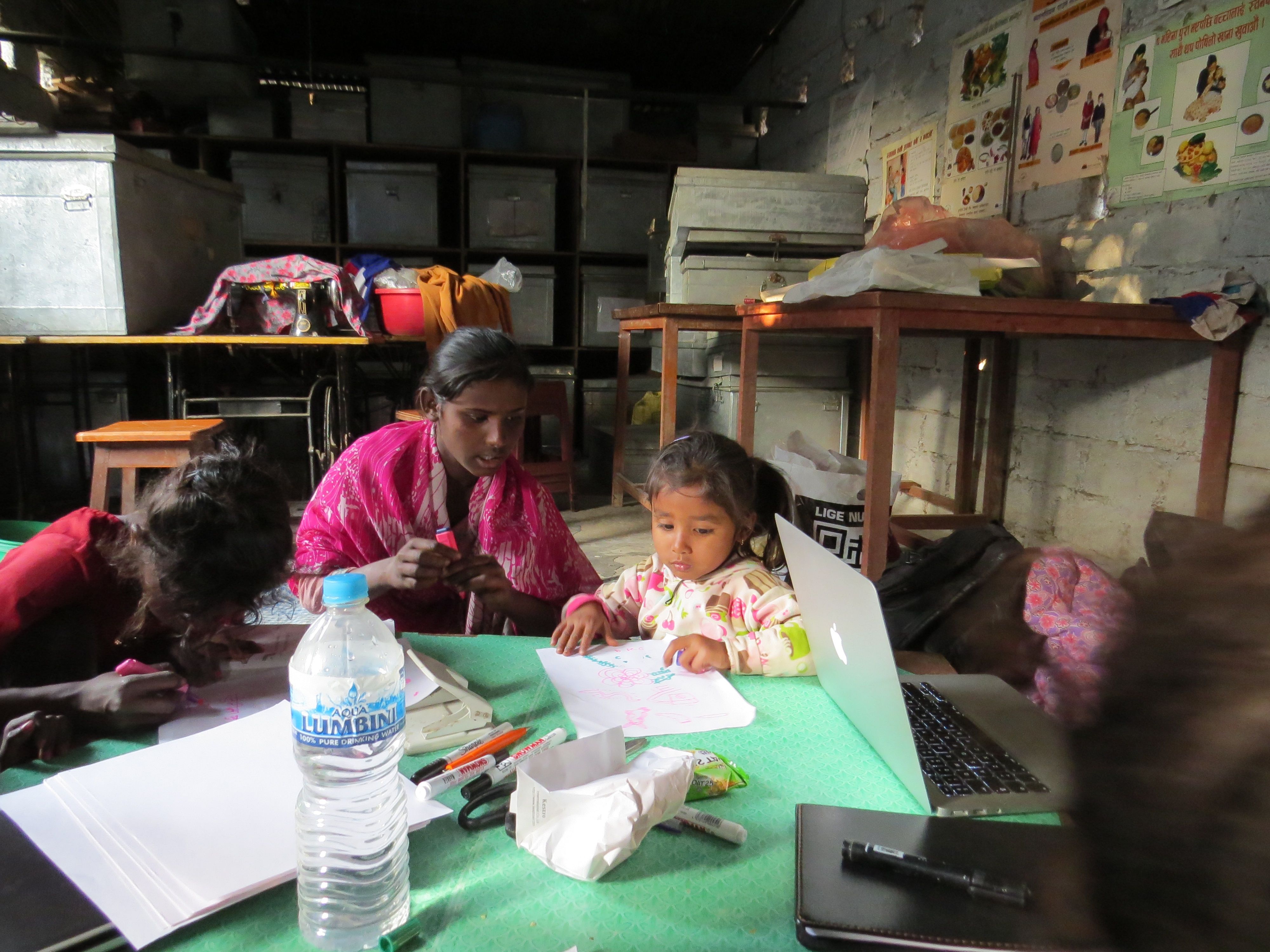 Selvom der var meget meget travlt, så blev der tid til en hyggestund med småpigerne fra Soiya. “Min mor er løbet hjemmefra,” sagde lille Swodiksha på bare 5 år. Her tegner hun sammen med Manisha. Vi vil gerne etablere lektiecafe i den gamle systue, for børnene mangler et sted at lave lektier, samt hjælp til lektierne.