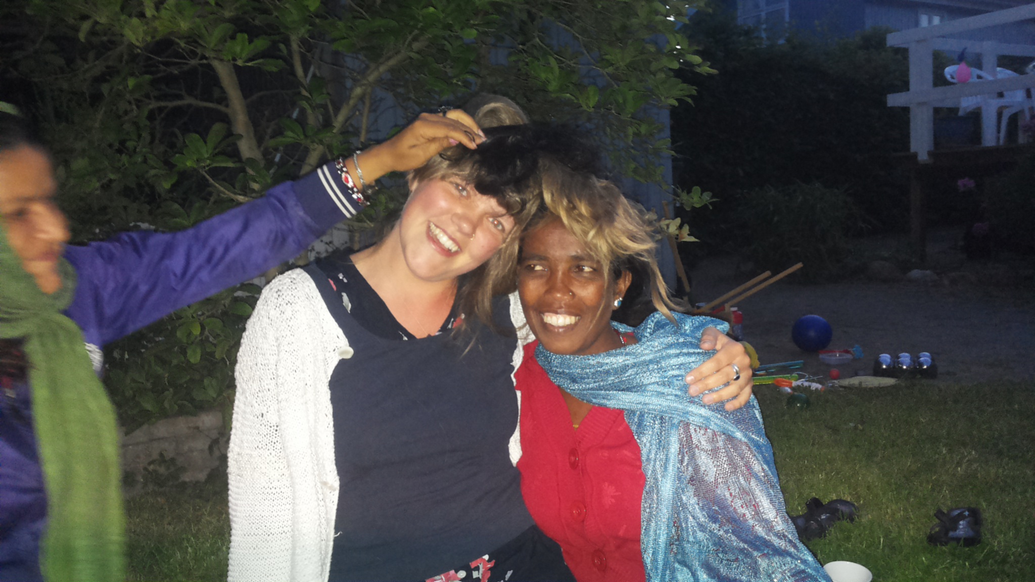 Om aftnen havde vi besøg af Anja, der var Skolelivs første praktikant. Anja har en helt særlig evne til at få folk til at grine. Her bytter hun hår med Sabitri – ja hvorfor ikke? Anja taler desuden rigtig godt nepali, hvilket gjorde aftenen både lang og hyggelig.