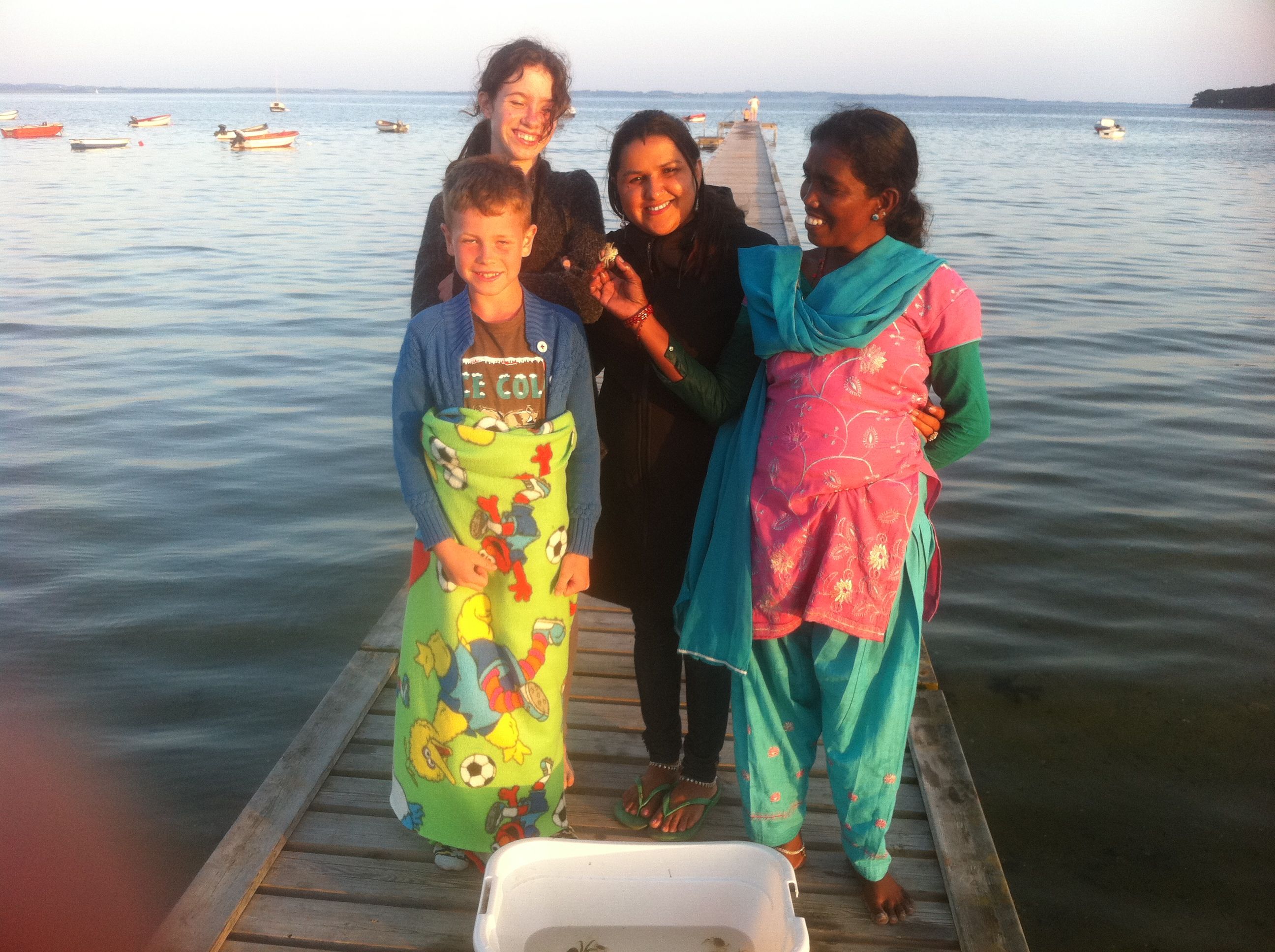 Det med at se på vand, blev der heldigvis mere tid til. I deres anden uge i Danmark, var Sabitri og Menuka på besøg hos Sara Cox fra Skolelivs bestyrelse. Sara og hendes to børn bor i Hornslet på Djursland lige ved havet. Allerede den første aften viste Sabitri, at hun var fantastisk til at fange krabber. Mens de andre sad med krabbestænger og madding, vadede hun simpelthen ind i tangen og tog krabberne 🙂 I Soiya er den slags jo mad!