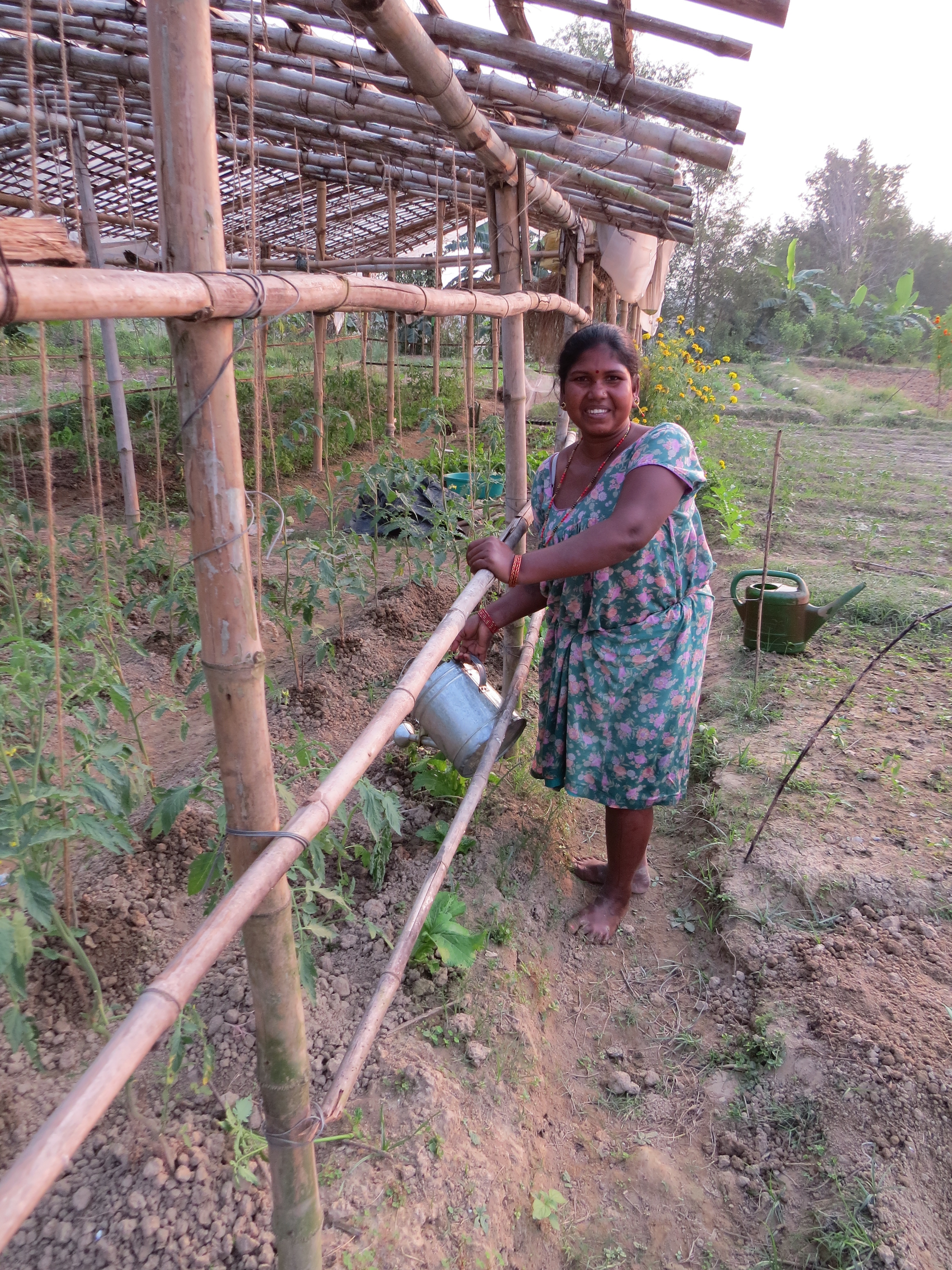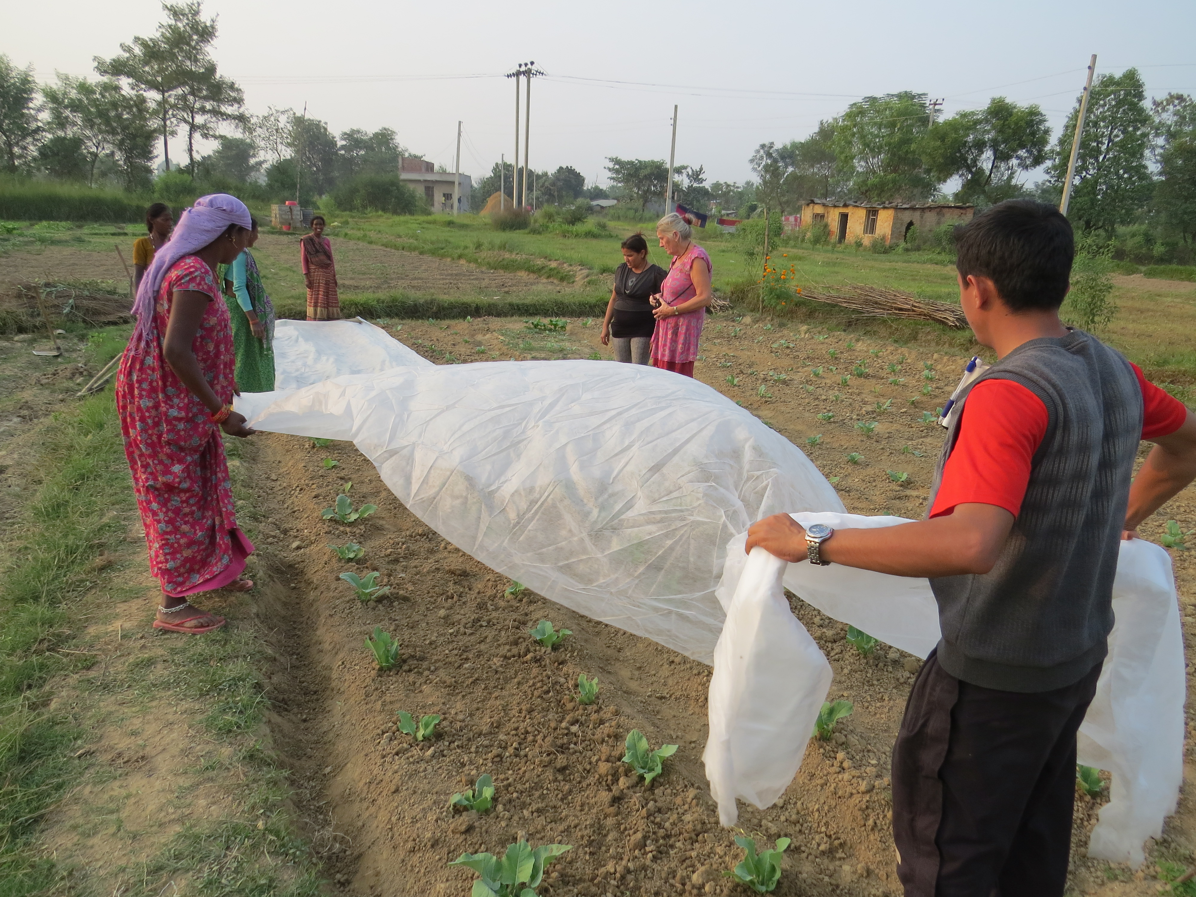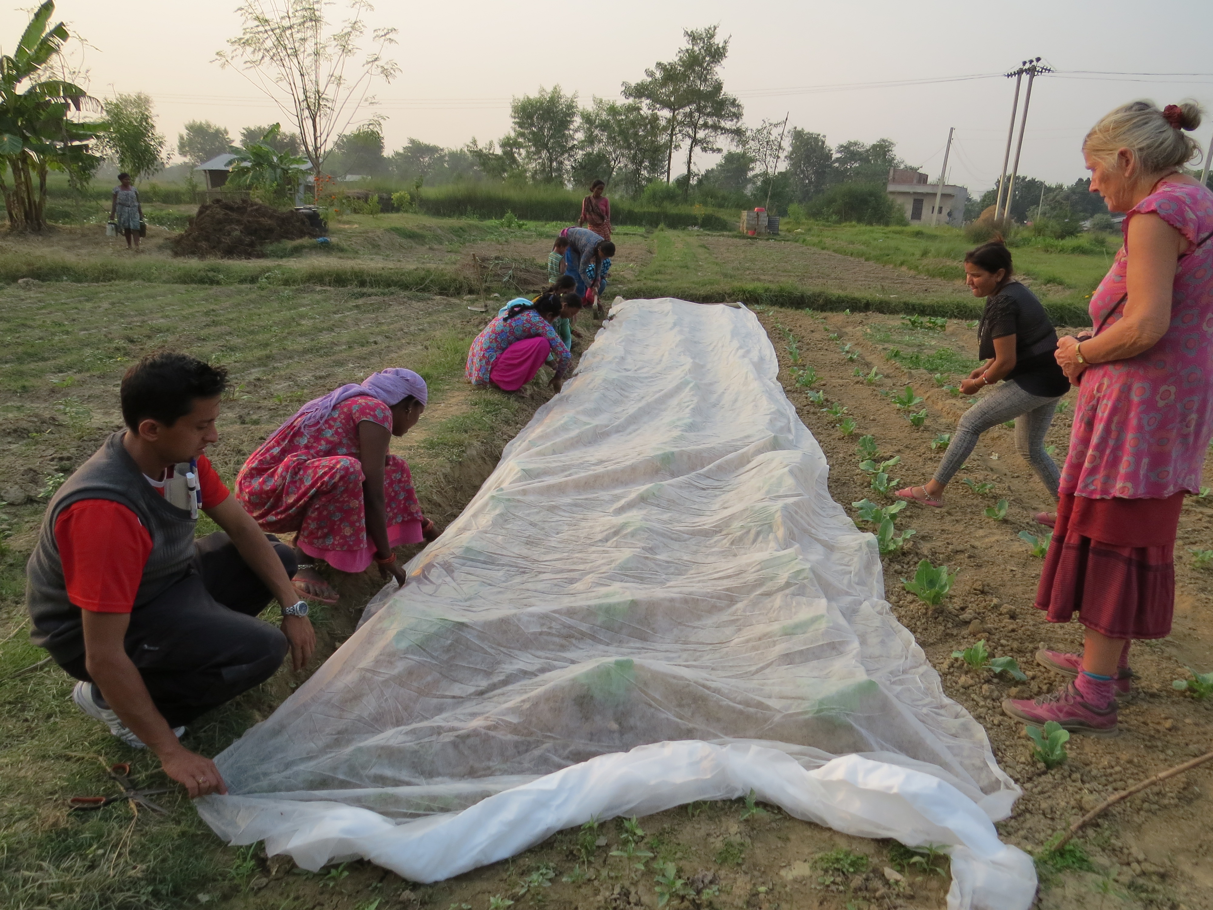 En af de ting vi besluttede var naturligvis at lægge net over vores nye små grøntsager på samme måde som de gør hos Ashapuri. Lis havde haft noget med fra Danmark tidligere, så det startede vi med.