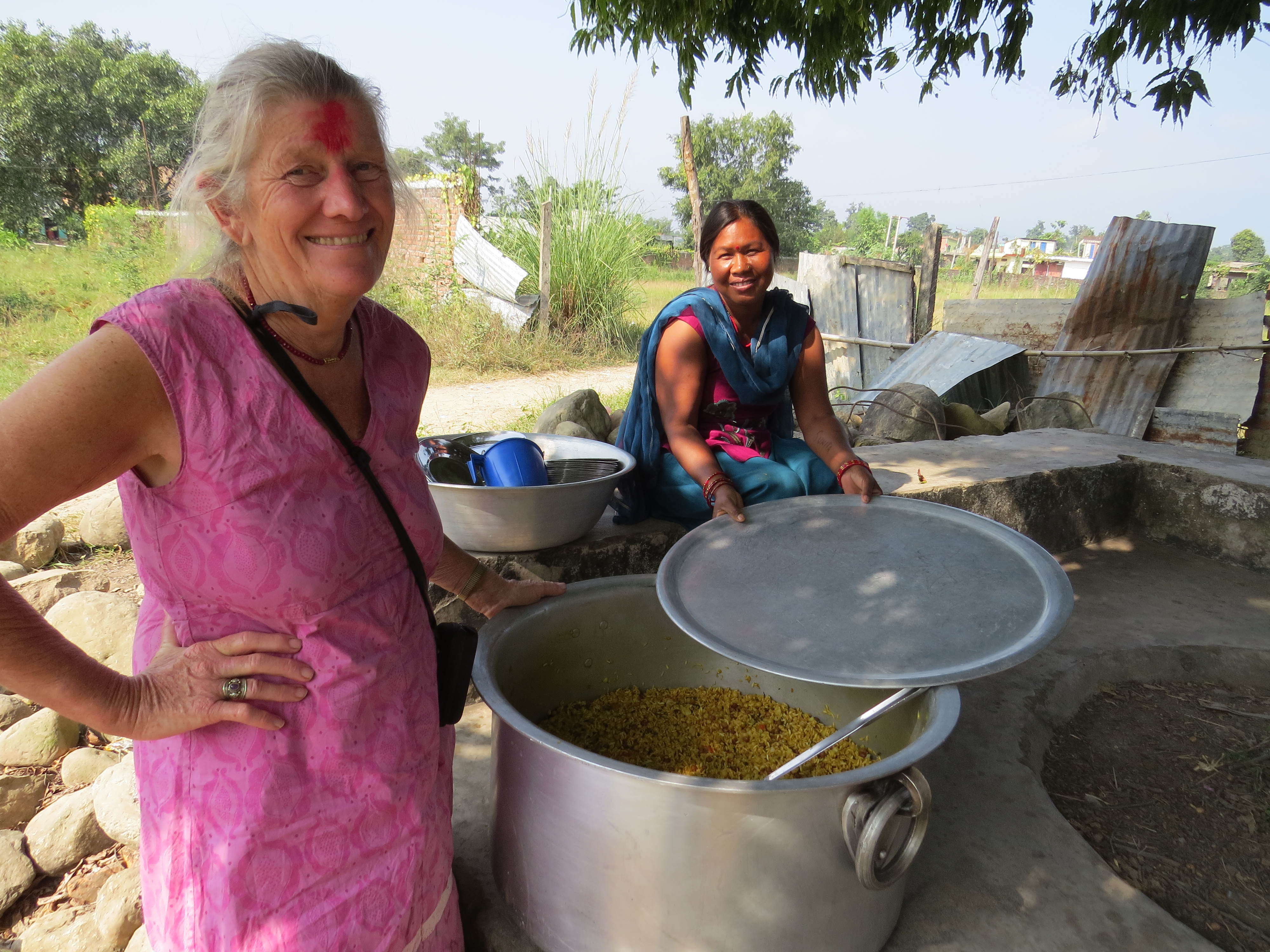Undertegnede sammen med de herlige unger og rektor Dinanath Aryal. Soiyas kvinder står for både indkøb og madlavning, så skolen skal ikke gøre andet end at bakke dem op, og det gør de så. Fremover håber vi at kunne lave andre projekter sammen med skolen.