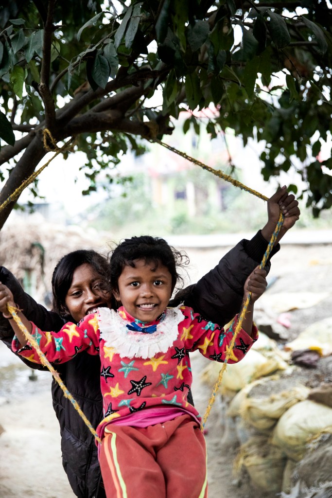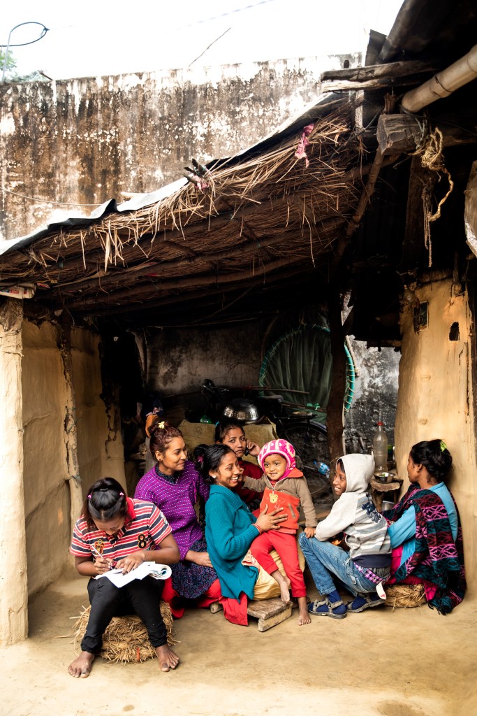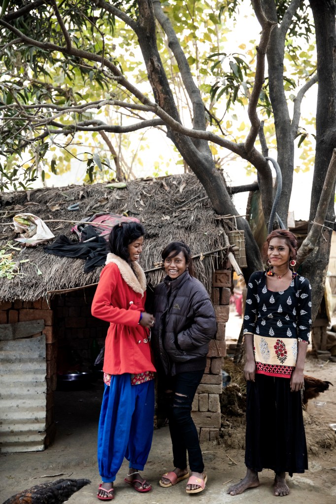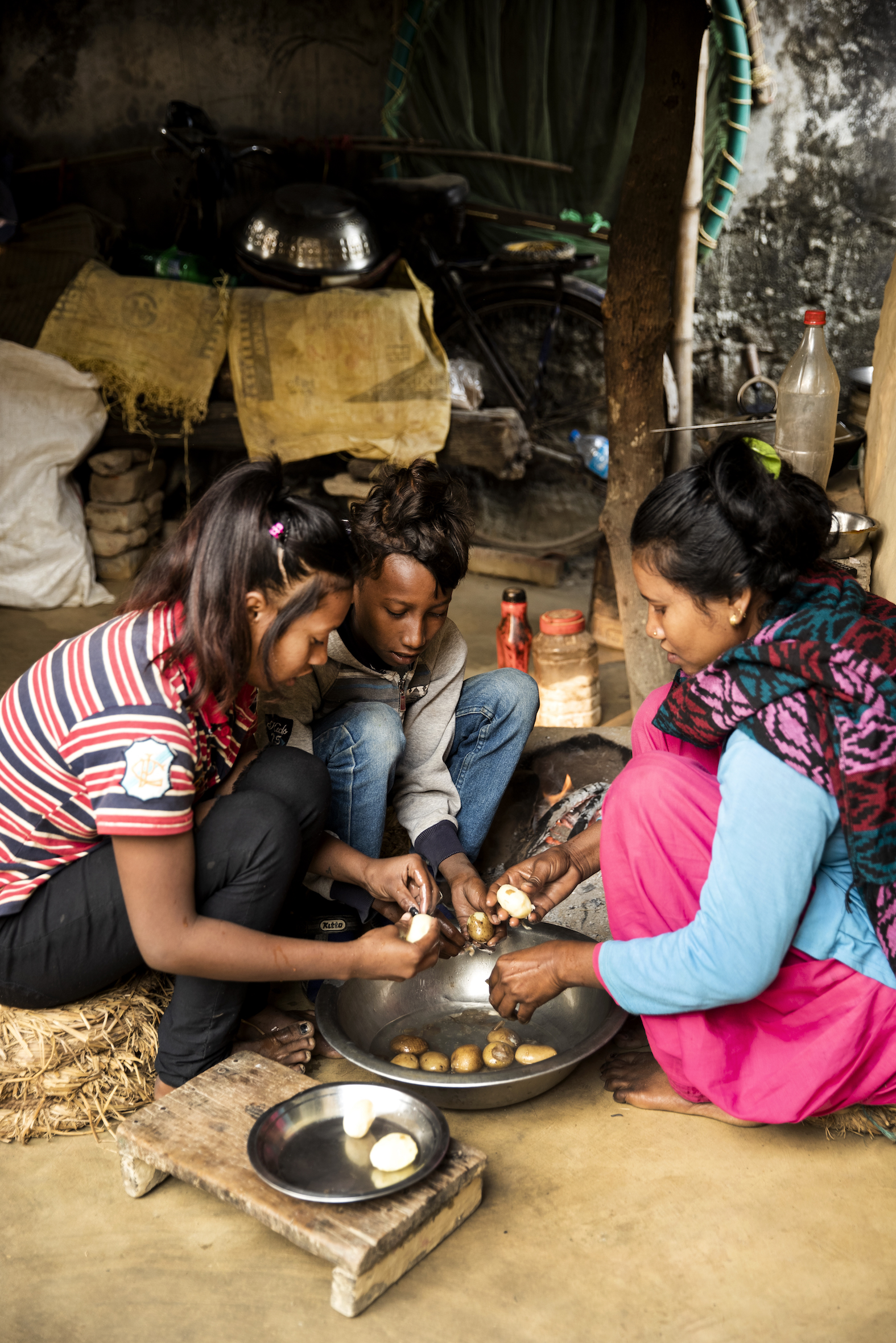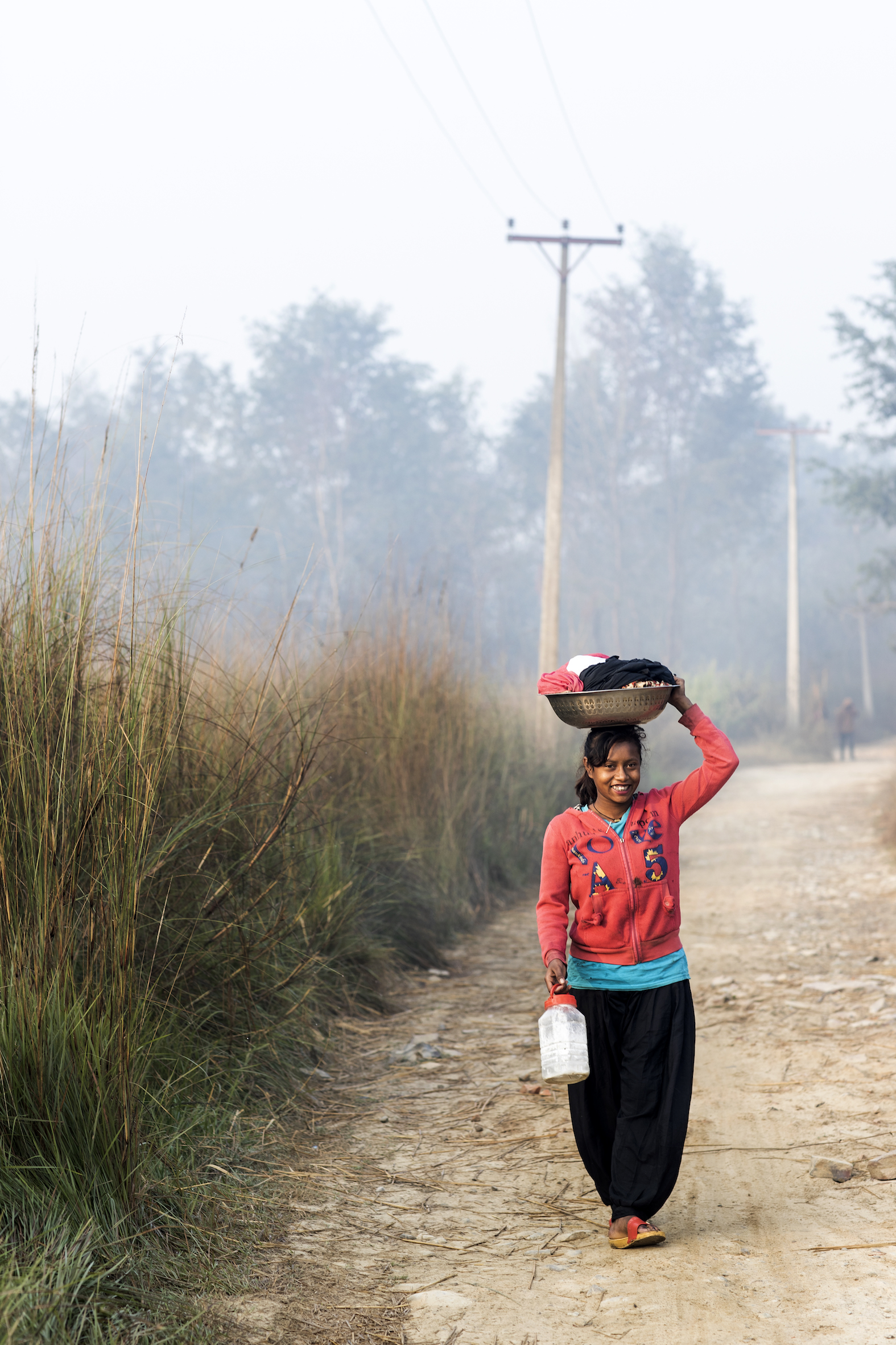 Anjali og hendes to veninder Sreejana og Sarita i deres lille landsby Soiya. Sreejana og Sarita har også gået i Anjalis klasse, men nu går de ikke længere i skole.Anjali sammen med Devi på 4 år. Devi er lige startet i børnehave på Anjalis skole.Verandaen foran Anjalis hus. Anjali laver lektier mens hendes mor og deres naboer hygger sig.Anjali på vej til floden for at vaske tøj.Anjali vasker tøj i floden hver lørdag, det har hun gjort siden hun var 12 år.Anjali, Vikram og Bishma har fået gratis skolemad siden de startede i skolen. Det er Skoleliv i Nepals støtter i Danmark, som betaler for maden.